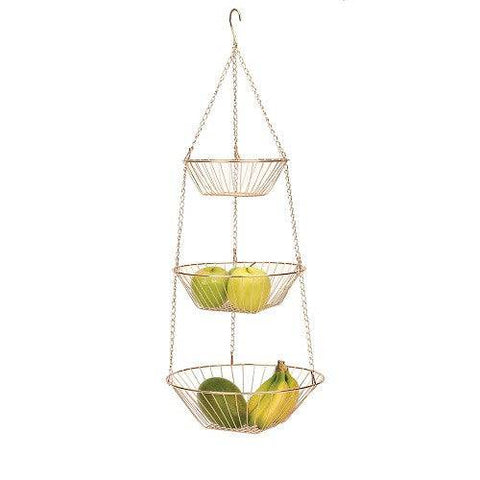 The RSVP copper wire 3-tier hanging basket will be a beautiful addition to your kitchen, porch, or house. This elegant basket can hold up to ten pounds, and has three tiers. This basket is sure to brighten up whatever spot you hang it in.
