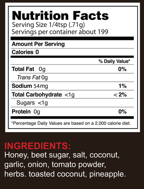 Honey, beet sugar, salt, coconut, garlic, onion, toasted coconut, pineapple, tomato powder, herbs
