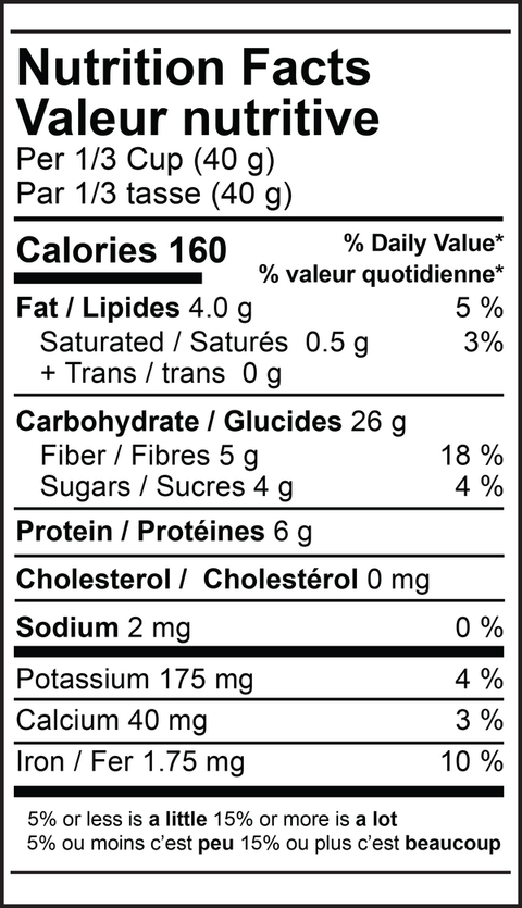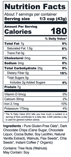 Gluten Free Oats, Currants, Apple, Flax Seeds, Mulberry, Chia Seeds, Cinnamon.