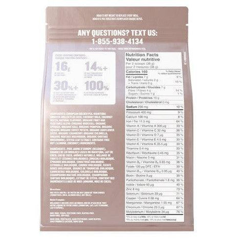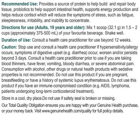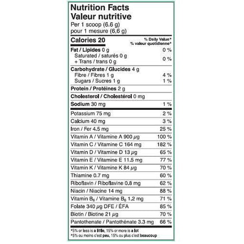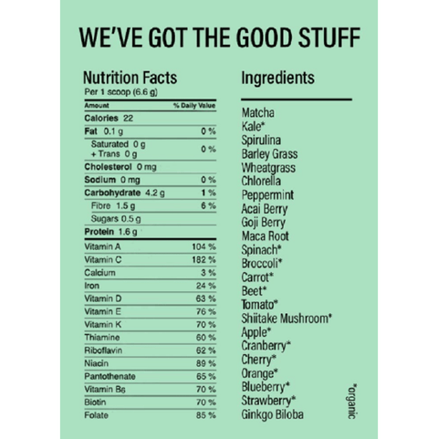 Matcha, organic kale, spirulina, barley grass, natural flavours, wheatgrass, chlorella, peppermint, acai, goji berry, maca, fruit and vegetable blend (organic spinich, organic broccoli, organic carrot, organic beet, organic tomato, organic shitake mushroom, organic apple, organic cranberry, organic orange, organic blueberry, organic strawberry), ginkgo biloba, stevia leaf extract, citric acid, maltic acid.