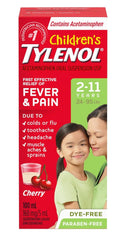Children's Tylenol® Dye-Free Cherry Liquid Medicine is a gentle, pediatrician-recommended medication for reducing fever or relieving pain in children. It contains acetaminophen, a safe and effective pain reliever and fever reducer, and comes in a delicious dye-free cherry flavour that's easy on little tummies.