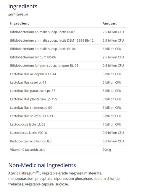 Bifidobacterium animalis subsp. lactis A026 Lactobacillus acidophilus A118 Lactobacillus casei A179 Lactobacillus gasseri A237 Lactobacillus jensenii A522 Lactobacillus paracasei A234 Lactobacillus plantarum A138 Lactobacillus rhamnosus GG Lactococcus lactis subsp. Lactis Other Ingredients: Fructo-oligosaccharide (Inulin) Magnesium stearate Silicon dioxide Maltodextrin Varies Starch Uni-Pure FL corn