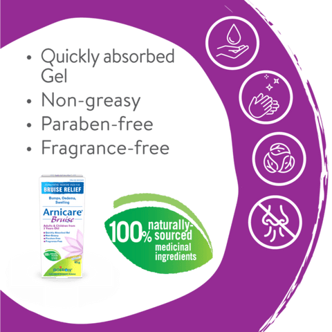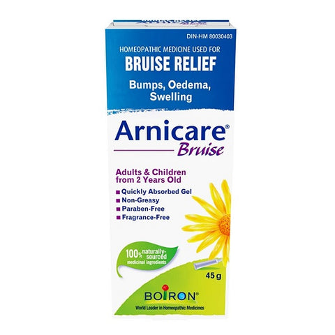 Arnicare Bruise Gel is a homeopathic medicine that eases resorption of bruises and inflammatory oedema (bumps) caused by falls, blows, blunt injury or surgery.* Relieves muscle and joint pain.*