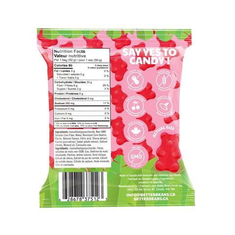 Better Bears are the natural choice for zero guilt, zero compromised snacking. Better Bears gummies is a smart choice towards a healthier lifestyle.* High in soluble fiber- each 50 gram serving has 80% of the daily recommended fiber requirements. Soluble fiber has been shown to promote good gut health.* Vegan: Better Bears are gelatin free and a great snack option for a plant based diet- better for you, and better for the environment. A win-win!