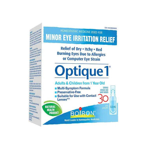 Boiron Minor Eye Irritation Relief Optique1 is a homeopathic medicine used to relieve minor eye irritations such as dryness, burning sensation, redness or itching due to allergies or pollution (ragweed, pollens, dust, smoke), strain, sustained visual efforts (computer, reading) or swimming.*