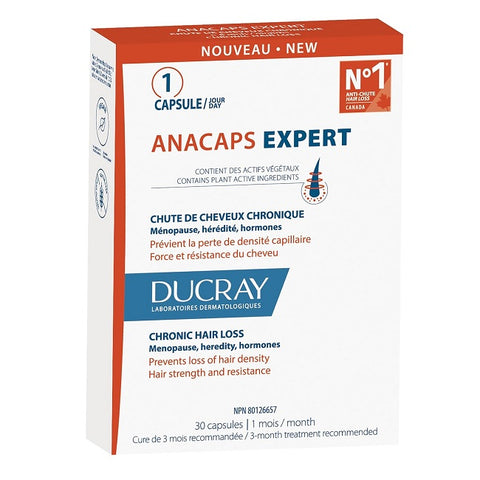 Ducray Anacaps Expert: Combat Chronic Hair Loss with Natural Strength. Reclaim your hair's vitality with Ducray Anacaps Expert Food Supplement. These vegan, gluten-free capsules, packed with plant-based ingredients, vitamins, and minerals, combat chronic hair loss, strengthen hair, and boost scalp microcirculation. Experience resilient, healthy hair with just one daily capsule.