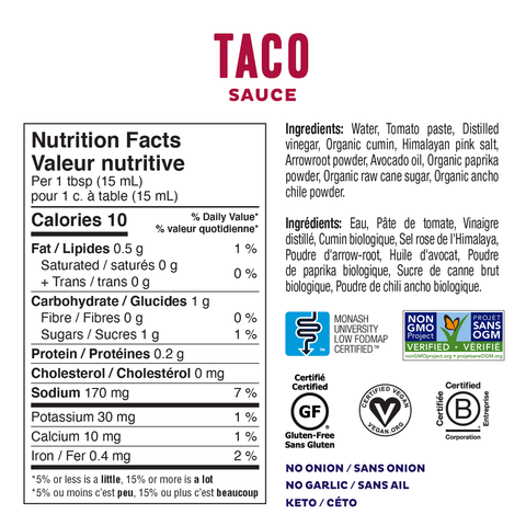 Introducing a Low FODMAP sauce with endless possibilities. Marinate, drizzle, and glaze your favourite dishes with mouth-watering flavour. Fody’s Low FODMAP, keto-friendly, and gluten-free Taco Sauce is perfect for sensitive stomachs and made with only the best gut-happy ingredients like crushed tomatoes, avocado oil, organic cumin, paprika, and Himalayan pink salt. Made with no onion or garlic. Say yes to eating well, then feeling well.*