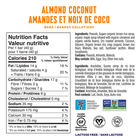 Peanuts, Dry Roasted Almonds, Organic Brown Rice Syrup, Coconut, Organic Maple Syrup Infused with Organic Cinnamon and Organic Vanilla Beans, Glycerin, Organic Brown Rice Crisps (Organic Brown Rice Flour), Walnuts, Sea Salt, Sunflower Lecithin, Sunflower Tocopherols.