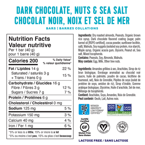 Dry Roasted Almonds, Peanuts, Organic Brown Rice Syrup, Dark Chocolate Flavoured Coating (Sugar, Palm Kernel Oil [RSPO Certified], Cocoa Powder, Sunflower Lecithin, Salt), Walnuts, Soy Nuggets (Isolated Soy Protein, Rice Starch), Maple Syrup, Organic Acacia Gum, Glycerin, Peanut Oil, Sea Salt, Mixed Tocopherols.