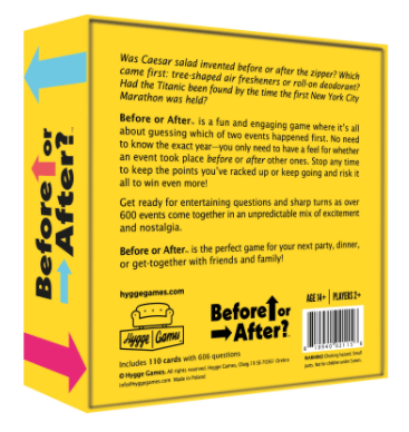 Was Caesar salad invented before or after the zipper? Which came first: tree-shaped air fresheners or roll-on deodorant? Had the Titanic been found by the time the first New York City Marathon was held? Before or after is a fun and engaging game where it’s all about guessing which of two events happened first. No need to know the exact year–you only need to have a feel for whether an event took place before or after other ones. Stop any time to keep the points you’ve racked up or keep going and risk it all to win even more! Get ready for entertaining questions and sharp turns as over 600 events come together in an unpredictable mix of excitement and nostalgia. The perfect game for your next party, dinner, or get-together with friends and family!