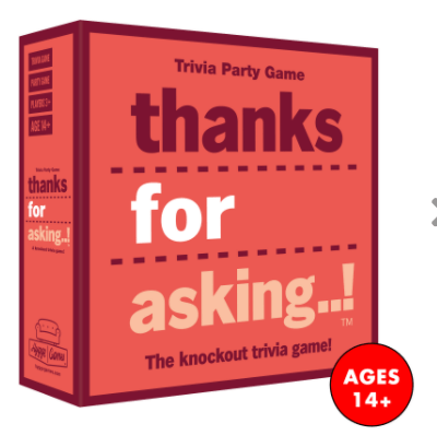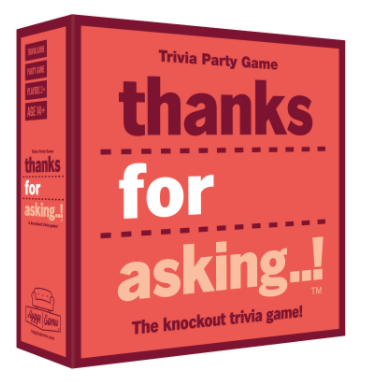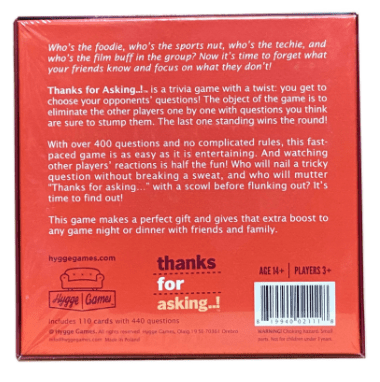 Who’s the foodie, who’s the sports nut, who’s the techie, and who’s the film buff in the group? Now it’s time to forget what your friends know and focus on what they don’t! Thanks for asking..! is a trivia game with a twist: you get to choose your opponents’ questions! The object of the game is to eliminate the other players one by one with questions you think are sure to stump them. The last one standing wins the round! With over 400 questions and no complicated rules, this fast-paced game is as easy as it is entertaining. And watching other players’ reactions is half the fun! Who will nail a tricky question without breaking a sweat, and who will mutter ”Thanks for asking...” with a scowl before flunking out? It’s time to find out! This game makes a perfect gift and gives that extra boost to any game night or dinner with friends and family.