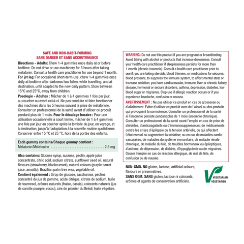 Chew 1-4 gummies once daily at or before bedtime. Do not drive or use machinery for 5 hours after taking melatonin. Consult a health care practitioner for use beyond 1 month. For jet lag: For occasional short-term use, chew 1-4 gummies once daily at bedtime after darkness has fallen, while travelling, and at destination, until adapted to the new daily pattern. Store between 15°C and 25°C, away from children.