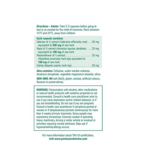 Consult a health care practitioner prior to use if you are breast-feeding. Do not use if you are pregnant. Consult a health care practitioner if symptoms persist or worsen or if sleeplessness persists continuously for more than 3 weeks (chronic insomnia). Consumption with alcohol, drugs, other medications or natural health products with sedative properties is not recommended. Some people may experience drowsiness. Exercise caution if operating heavy machinery, driving a motor vehicle or involved in activities requiring mental alertness within 2 hours of consumption. Hypersensitivity/allergy has been known to occur; if this occurs, discontinue use.