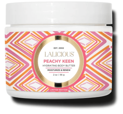 Lalicious Peachy Keen Body Butter smooths and nourishis skin.* Shea Butter and Safflower Oil provide intense hydration to seal in moisture while leaving skin silky smooth.* Aloe Vera and Vitamin E nourish and protect to keep skin looking radiant from head to toe.* Drench the body in this whipped cream with an intoxicating scent of creamy peach, sweet berries and jasmine petals for deliciously soft skin.*