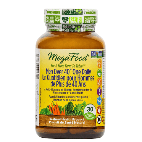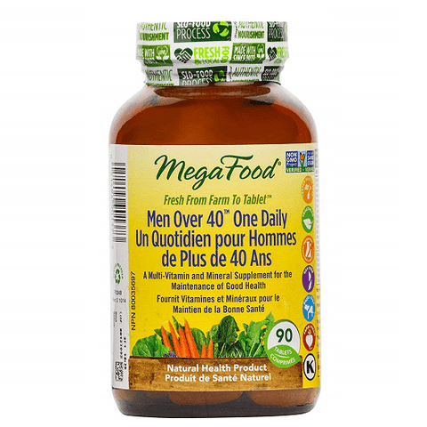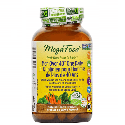 MegaFood Men Over 40 One Daily is specifically formulated without iron to support the health and wellbeing of men over the age of 40.* (Iron is not recommended for men unless specifically directed by their healthcare practitioner.) MegaFood multi nourishes the body in a convenient, once-daily tablet that can be taken with or without food, and includes FoodState B vitamins to assist with already healthy cardiovascular function, healthy energy production and nervous system health.* 400 IU (10 mcg) of vitamin D supports already healthy bones and mood, and an array of whole foods and herbs provide additional antioxidants and carotenoids.*