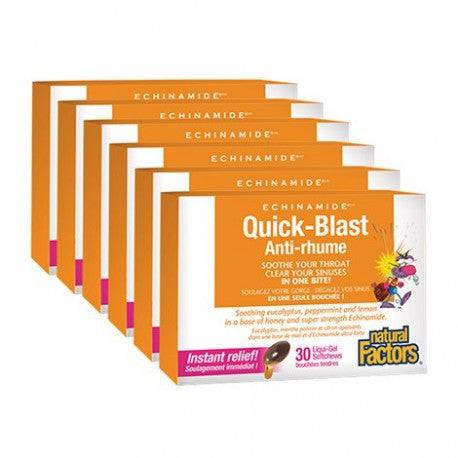 Natural Factors ECHINAMIDE Quick-Blast combines eucalyptus, peppermint, menthol, and lemon in a base of ECHINAMIDE and honey. Quick-Blast brings soothing relief to sore throats and clears sinus congestion. It shortens the duration of upper respiratory tract infections such as the common cold while also relieving the symptoms.*