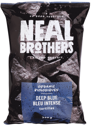 Neal Brothers Tortilla Chips - Deep Blue 300 g are packed with the goodness of organic blue corn, sunflower oil and sea salt. Whether you’re snacking straight from the bag or dipping into a Neal Brothers Salsa, Deep Blue will take you to new depths of deliciousness.