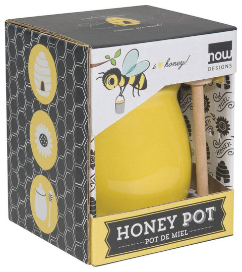 Gorgeous glazed stoneware hides one of nature's treasures, and it measures 3.25 inches in diameter and 4 inches tall. Golden honey makes its home within the gentle curves and notched lid, and the birch dipper makes drizzling easy.