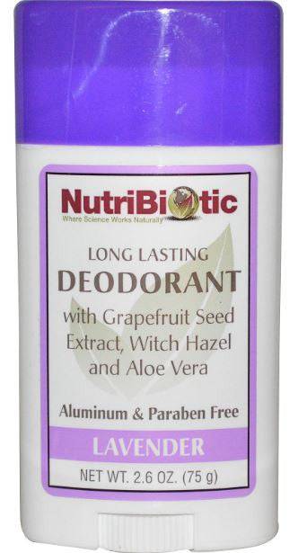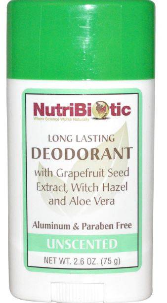 NutriBiotic Deodorant is a long lasting deodorant containing grapefruit seed extract, witch hazel, and aloe vera.