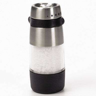 Salt Grinder, 10 oz/280ml, 5.5"/14cm, stainless steel and acrylic, BPA free. Adjustable grinder setting from fine to coarse. Soft, non-slip grip. Non-corrosive ceramic mechanism. Clear acrylic body highlights contents and indicates when it is time to refill. Salt grinder is pre-filled with sea salt.