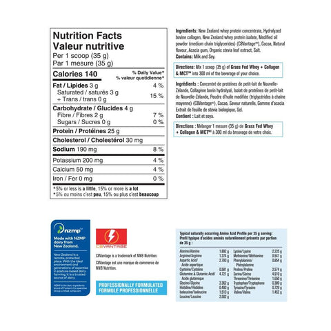 New Zealand whey protein concentrate, Hydrolyzed bovine collagen, New Zealand whey protein isolate, Modified oil powder (medium chain triglycerides) (C8Vantage), Cocoa, Natural flavour, Acacia Gum, Organic stevia leaf extract, salt.
