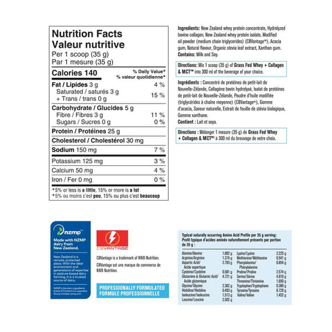 : New Zealand whey protein concentrate, Hydrolyzed bovine collagen, New Zealand whey protein isolate, Modified oil powder (medium chain triglycerides) (C8Vantage), Acacia gum, Natural flavour, Organic stevia leaf extract, Xanthan gum.