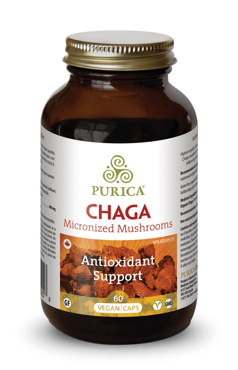 Regarded in ancient China and Russia as the “King of Herbs”, Chaga is acknowledged for its remarkably high levels of antioxidants (approximately 50 times that of blueberries).* A dark, woodlike fungus that is also a rich source of powerful phytochemicals such as sterols, phenols, beta-glucans and melanin, Purica Chaga is lab-grown and micronized to improve absorption and potency by 5 to 10 times.* For possible benefits beyond antioxidants and stress relief, Purica Chaga is considered to be a potent immune system enhancer.* It’s another in the fine line of natural health food and supplements from Purica.