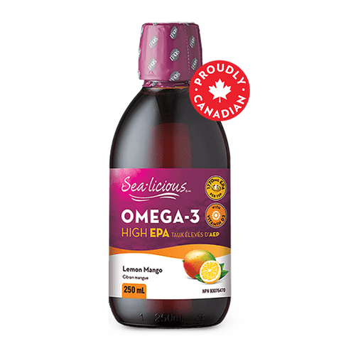 Sea-Licious Omega-3 High EPA - Lemon Mango Flavour is formulated to provide a more therapeutic dose of concentrated EPA and DHA to help target specific health concerns.* Each teaspoon provides a balanced 2:1 ratio of 1770mg EPA, 885mg DHA with 400IU vitamin D3 along with powerful astaxanthin antioxidant and green tea extract.