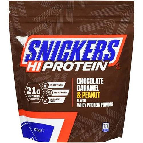 This Snickers Whey Protein - Chocolate Caramel Peanut 875 g contains nearly 21 grams of the protein. The candy bar themed supplements include 4g of fat, 5g of carbohydrates, and 141 calories. If you are a peanut butter lover, this is the protein for you. this protein will provide you with signature real chocolate taste with a lot less sugar.*