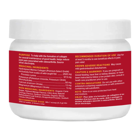 - Hydrolyzed Marine Collagen (Ultra-Pure TruMarine® Collagen from wild-caught fish scale), Sodium Chloride, Potassium Chloride, Calcium Citrate, Magnesium Citrate, Sodium Citrate, Potassium Citrate, Organic Cane Sugar, Natural Mango Flavour, Citric Acid, Natural Orange Flavour, Dragonfruit Powder, Organic Stevia Rebaudiana Leaf Extract