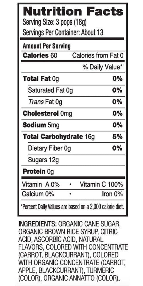 Organic Cane Sugar, Organic Brown Rice Syrup, Citric Acid, Ascorbic Acid, Natural Flavors, Colored With Concentrate (Carrot, Blackcurrant), Colored With Organic Concentrate (Carrot, Apple, Blackcurrant), Turmeric (Color), Organic Annatto (Color).